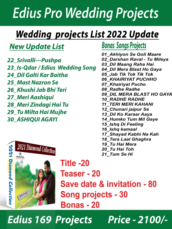 Title -20 Teaser - 20 Save date & invitation - 80 Song projects - 30 Bonas - 20