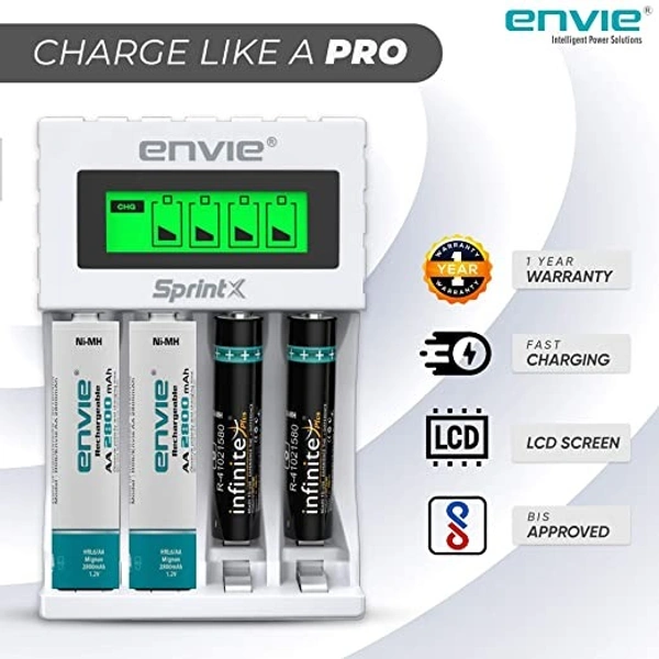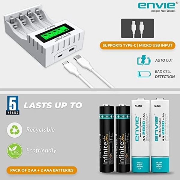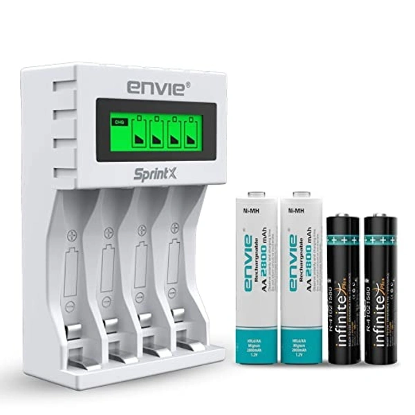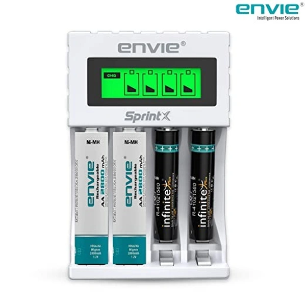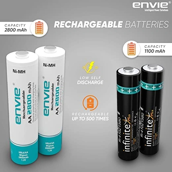 - Charger comes with 2 nos of Envie AA 2800 Mah and 2 nos of AAA1100 Infinite Rechargeable Battery