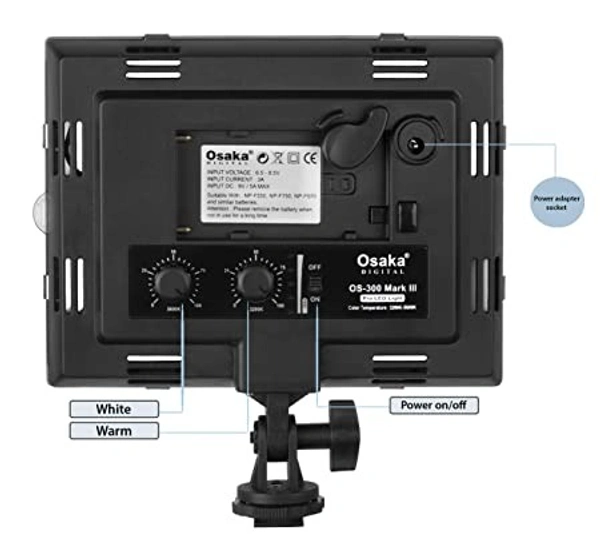 - Contents : LED Light OS 300 MARK III - 1 no, Lithium Ion Battery F550 (2800 mAh) - 1 no, Ultra Fast Charger F550/ F750/ F980, Li-ion Battery - 1 no, Diffuser - 1 no, Handle - 1 no. Output Power : 18 Watt, Lumen : 2650 Lumen, Power Supply : Sony Series Lithium Ion Batteries (Osaka F550 Battery included in the kit) or external 9V 5A DC power supply (External Adapter not included in the kit), Dimension 173 x 153 x 46mm, Net Weight : 439g (excluding battery)