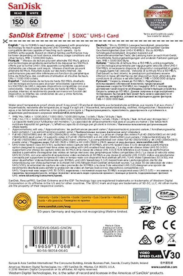 SanDisk Extreme SDXC, SDXVE 64GB, V30, U3, C10, UHS-I, 90MB/S R, 40MB/S W, For 4K Video