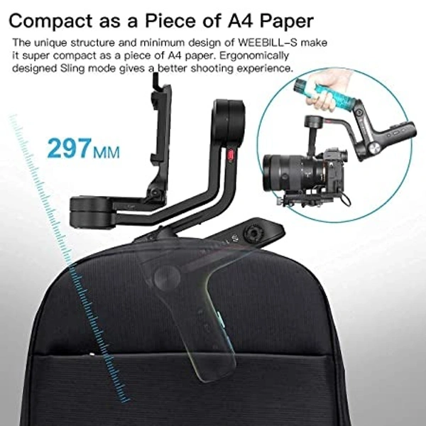 - Lightweight & Compact: Weight as light as 895g, the unique structure and minimum design of WEEBILL-S make it super compact as a piece of A4 paper. With the ergonomically designed Sling mode, WEEBILL-S provides an effortless shooting experience for anyone.