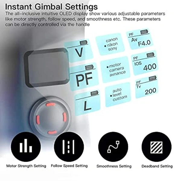 - OLED Display for Instant Gimbal Settings: The all-inclusive intuitive OLED display can show various adjusted parameters like motor strength, follow speed, smoothness, deadband, key customization and etc, all of which can be directly controlled via the handle without having to enter the App.